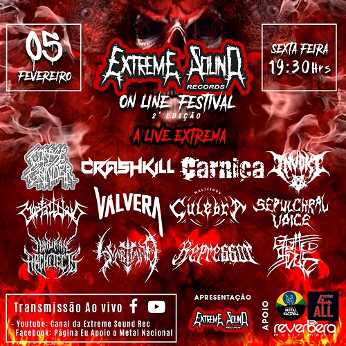 O selo e gravadora Extreme Sound Records, em parceria com a página Eu Apoio o Metal Nacional, Reverbera Music Media e Estúdio 4ALL, apresentam na sexta-feira, 05 de fevereiro, às 19h30, a segunda edição do “Extreme Sound Records – Online Festival”.
