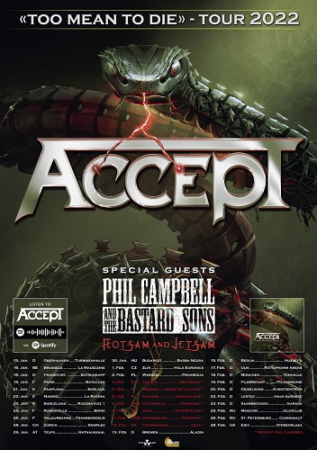 Accept terá o suporte na Europa da banda Phil Campbell and the Bastard Sons, que de forma inesquecível levou locais de todo o mundo ao ponto de ebulição com Motörhead e que também representa o puro Rock N’Roll, porque mesmo sem Lemmy (RIP), Phil tem os controles definidos para 12 ou 13!