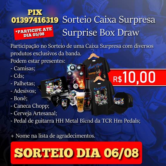 Para ganhar os itens de colecionador, como camiseta, palhetas, caneca de chopp e os demais que estão listados na imagem abaixo, basta participar do sorteio que será realizado no dia 06 de agosto de 2021, próxima sexta, às 20h00, em uma ‘live’ no Instagram da banda. A participação se efetivará através de um PIX no valor de R$ 10,00 para o indicado abaixo: