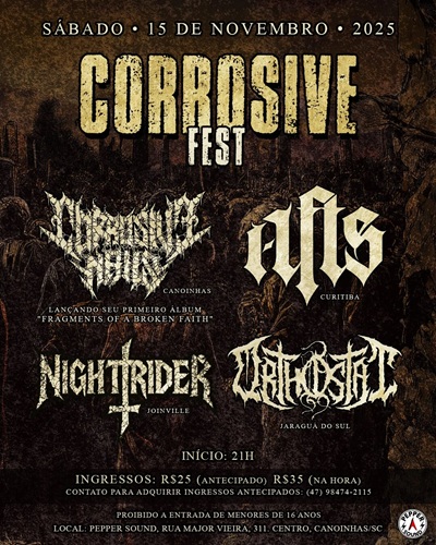 O quarteto pega a estrada rumo a Canoinhas/SC, onde, no dia 15/11/2025 (sábado), acontecerá o “Corrosive Fest”. O evento, programado para as 21h00 no Pepper Sound (@peppersound.canoinhas), contará também com Away From The Sun, Nightrider e Corrosive Nails.
