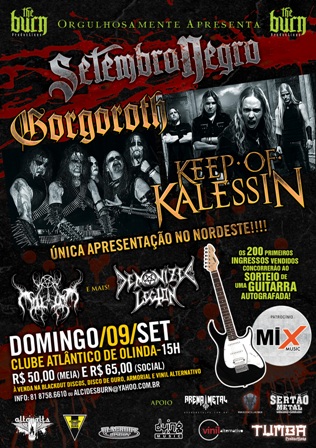 A The Burn Productions, produtora que realizará o Festival Setembro Negro em Pernambuco, que tem como bandas principais as norueguesas Gorgoroth e Keep of Kalessin, anuncia que as pessoas que comprarem os 200 (duzentos) primeiros ingressos irão participar de um sorteio que brindará o ganhador com uma guitarra autografada – patrocinada pela Mix Music – por ambas as bandas.