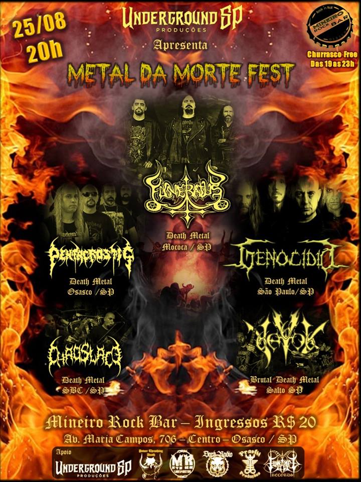 Sob o título de “Metal da Morte Fest”, o evento vai receber ainda os lendários Pentacrostic e Genocídio, se juntam ainda duas forças da nova safra do Death Metal brazuca: Chaoslace e Havok 666.
