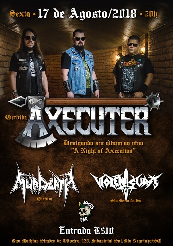O Axecuter retorna à Santa Catarina neste fim de semana para duas apresentações. Nesta sexta-feira (17/agosto) o grupo viaja até Rio Negrinho/SC, onde estará divulgando seu novo álbum ao vivo, “A Night Of Axecution” no “Magos Fest”, ao lado das bandas Murdeath e Violent Curse. Para mais informações clique aqui.