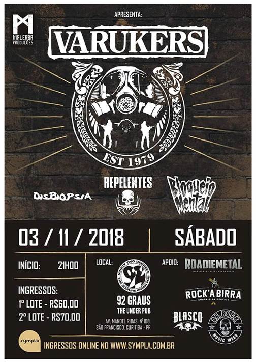O evento será realizado no Pub 92 Graus, situado no bairro São Francisco, em Curitiba. Seu início se dará às 21h00 e o preço das entradas variam de R$ 60,00 (primeiro lote) a R$ 70,00 (segundo lote). The Varukers em Curitiba é uma realização da Malerba Produções e tem o apoio da Roadie Metal, do Rock’A Birra, do Dr. Rock Music Wear e do Blasco Clothing.