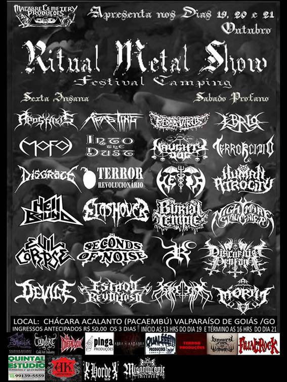 Entre os dias 19, 20 e 21 de outubro, o interior de Goiás, mais precisamente a cidade de Valparaíso, divisa com o Distrito Federal, terá um evento digno de respeito por todo o projeto que está sendo envolvido e organizado para o “Ritual Metal Show Festival Camping”.