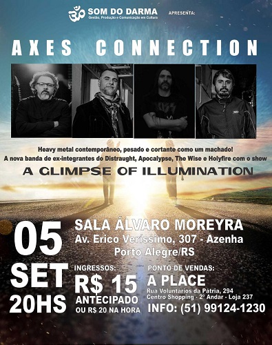 O Axes Connection toca Heavy Metal! Pesado e cortante como um machado! Um novo som, contemporâneo, composto e gravado por músicos que acumulam décadas de experiência: o vocalista Márcio Machado, o guitarrista Marcos Machado (ex-Distraught) e o baixista Magoo Wise (ex-The Wise, ex-Distraught, ex-Apocalypse).