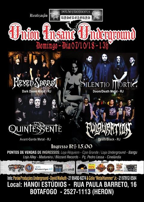 Dia 07 de outubro, na cidade do Rio de Janeiro, será realizado o evento “Union Insane Underground” que irá reunir quatro grandes bandas da cidade em apresentações pesadas e de altíssimo nível.