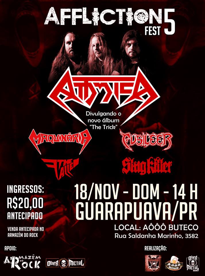 O trio se apresentará no “Affliction Fest 5” que estará trazendo para Guarapuava/PR no dia 18/11/2018, um dos principais nomes do Thrash Metal brasileiro: o Attomica. O show acontecerá no Aôôô Boteco e contará também com Maquinária, Slug Killer e The Fallen. Para mais informações clique aqui.