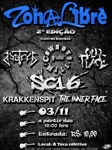 Dia 03 de novembro a cidade de Goiânia terá uma reunião de seis grandes bandas locais se apresentando no A Toca Coletivo. O evento “Zona Libre” chega a sua segunda edição e tem como atrações as bandas Krakkenspit, Old Place, SC16, The Innerface, Dyatryb e Cowboys From Hill.