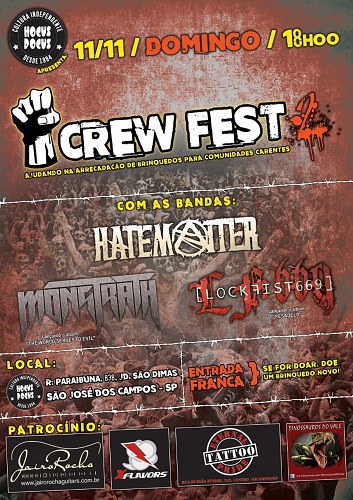 A organização do festival pede, a todos que puderem, para doar um brinquedo novo na entrada, pois o “Crew Fest 2” está participando na campanha de “Arrecadação de Brinquedos 2018”. Mais informações podem ser adquiridas aqui.