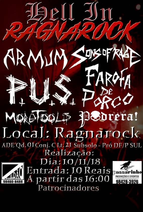 Dia 10 de novembro a cidade de Brasília recebe várias bandas da cidade e região no primeiro “Hell in Ragnarock”. O evento irá mesclar bandas de Thrash e Death Metal, apresentando uma proposta mais voltada ao estilo extremo do Metal produzido no país.
