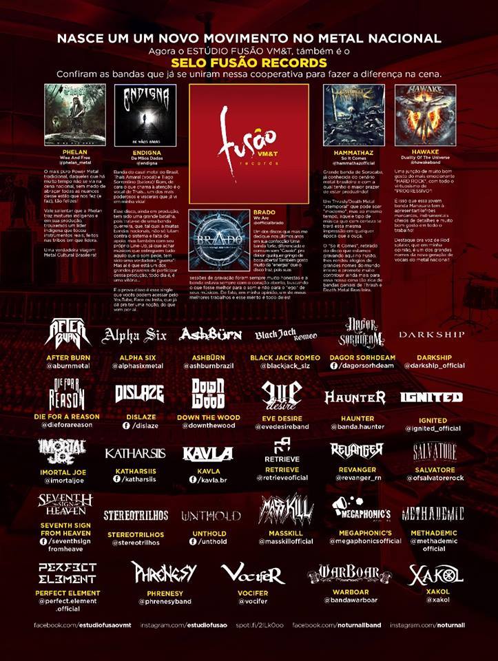 Em uma iniciativa louvável, o estúdio Fusão, um dos principais estúdios da América Latina, lançou seu selo com intuito de apoiar as bandas independentes que gravam por lá. Leia a publicação do estúdio: “É com muito prazer e orgulho que anunciamos oficialmente aberto, o selo do Estúdio Fusão! Uma iniciativa nossa para lançar todas as bandas que necessitem e queiram ter uma casa para serem tratados como grandes bandas merecem! Sem fins lucrativos, é o estúdio Fusão e sua equipe botando a cara para bater em unificar e ajudar a cena METAL BRASILEIRA a crescer cada vez mais!”. (Leia a nota original clicando aqui).