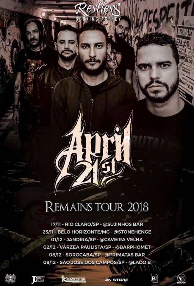 O início de dezembro será uma verdadeira maratona para o April 21st: dia 01 a banda estará em Jandira/SP; na sequência, dia 02, será a vez da cidade de Várzea Paulista receber o grupo mineiro. Após uns dias de descanso, o grupo retorna para a estrada e dia 08 se apresenta em Sorocaba/SP e de lá parte para São José dos Campos/SP, encerrando a primeira etapa do “Remains Tour 2018”.
