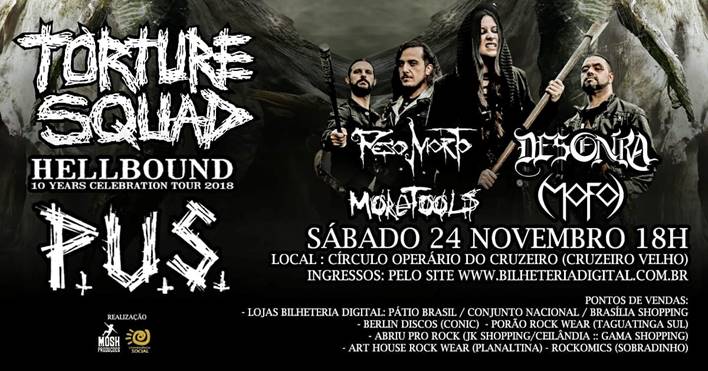 Em mais uma tour aclamada pelo Brasil, excursionando por todos os estados do país, o Torture Squad aporta em Brasília para apresentar aos fãs locais a celebração de 10 anos do álbum “Hellbound” (2008).