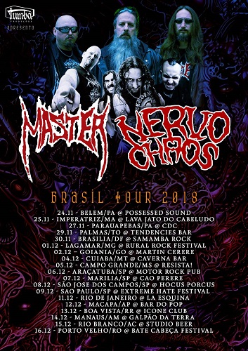 No terceiro ato, a banda ‘parceira’ é ninguém menos que a lendária Master, considerada uma das precursoras do Death Metal e que dispensa maiores apresentações. Todas as datas e detalhes estão na fanpage oficial do NervoChaos: www.facebook.com/NervoChaos.