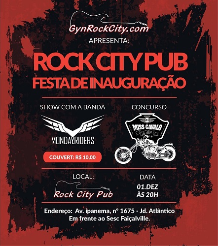 O Pub, que abre suas portas oficialmente hoje, dia 01 de dezembro, é o Rock City Pub, localizado no Jardim Atlântico, em frente ao SESC Faiçalville, e de quebra, em sua inauguração, o Monday Riders, banda de Hard/Classic Rock da cidade, se apresenta oficializando a abertura de mais um espaço para os fãs de Rock de Goiânia.