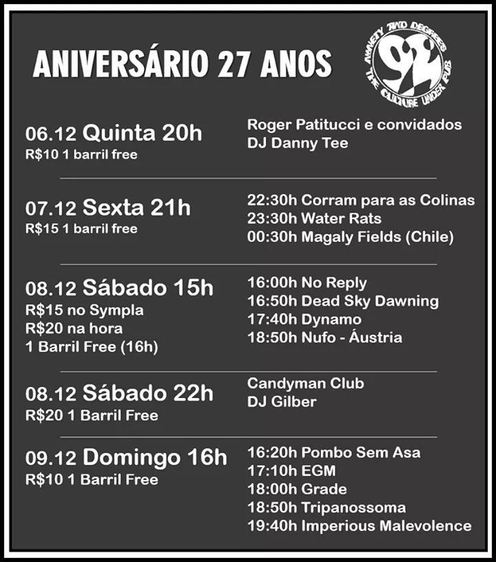 A banda estará presente no evento de aniversário de 27 anos do 92° - The Underground Pub em Curitiba/PR, que acontecerá entre os dias 06 e 09 de dezembro e contará com outras 14 atrações. A apresentação do grupo será no domingo (09/12), ao lado de Tripanossoma, Grade, EGM e Pombo Sem Asa. Para mais informações clique aqui.