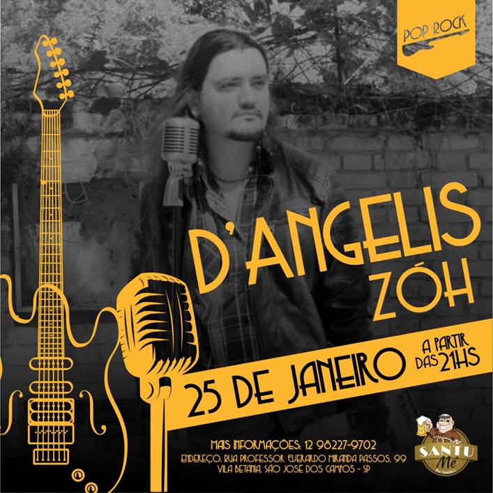 O músico D’Angelis Zóh leva todo seu talento e repertório variado para o “Santu Mé” na próxima sexta-feira, a partir das 21h00. O evento será realizado na cidade de São José dos Campos e ao lado de outros grandes músicos. Uma seleta seleção de músicas atemporais serão partes importantes para entreter o público do ambiente.