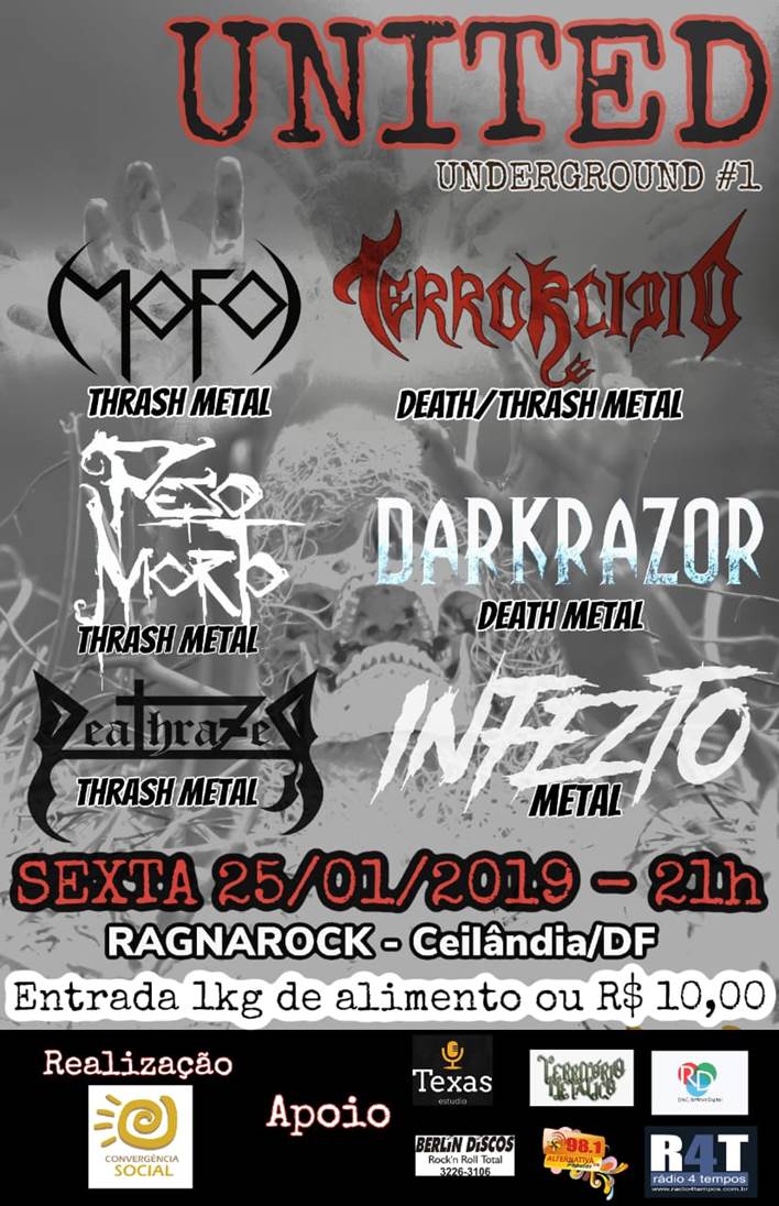 Além do Mofo, as bandas DeathraZer, Dark Razor, Peso Morto, Infezto e Terrorcidio, são atrações confirmadas em um evento que promete ser um dos mais pesados do ano. Intitulado de “United Underground #1”, visa dar início à uma verdadeira ode ao Metal extremo e se consolidar como um ‘fest’ de total apoio ao autoral e as bandas locais.