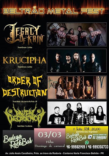 Para os foliões do Carnaval Metálico do estado do Paraná, pode prepara suas almas e corpos, pois as bandas Krucipha, Legacy Kain e Order of Destruction/SP, estarão fazendo uma mini tour por três cidades distintas, entre os dias 02, 03 e 05 de março, respectivamente, nas cidades de Guarapuava/PR, Francisco Beltrão/PR e Araucária/PR.