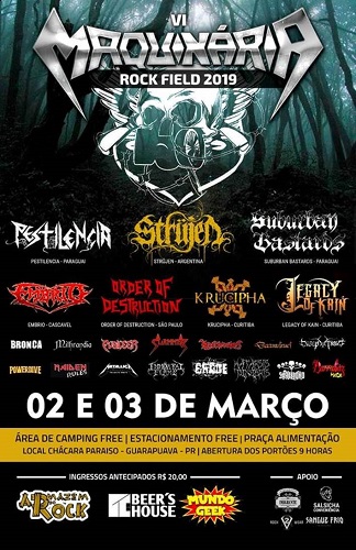 O primeiro evento é o “VI Maquinária Rock Field 2019”, que contará com 22 bandas se apresentando em um megafestival, onde as apresentações terão início as 14h00 do dia 02 e se encerrarão somente no dia 03. O Krucipha e as bandas Legacy Kain e Order of Destruction, organizam uma van com saída de Curitiba direto para Guarapuava, com o custo de R$ 100,00, já incluso o ingresso para o dia 02, data onde as três bandas se apresentam. Interessados em acompanhar as bandas para o festival, clique aqui.