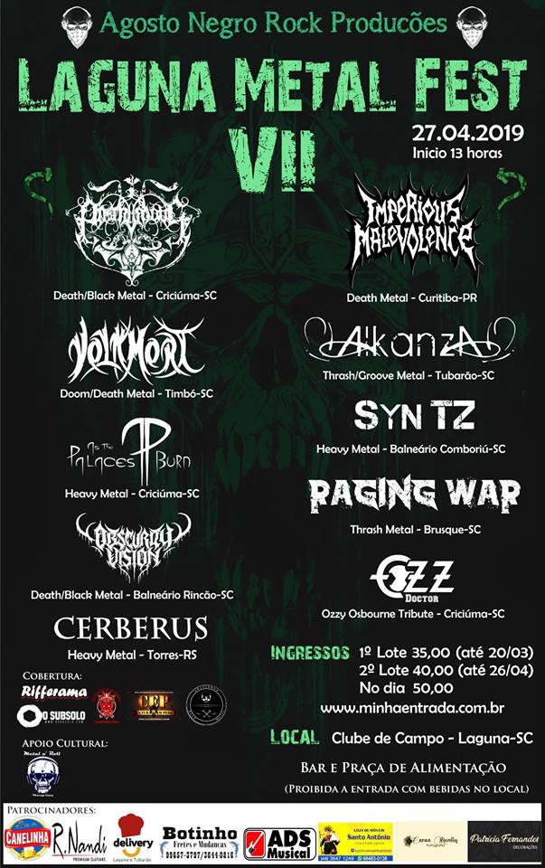 A banda confirmou presença desta vez no já conhecido “Laguna Metal Fest”, que chega a sua sétima edição no próximo dia 27/04/2019. Se apresentarão neste evento também nomes como Posthumous, Volkmort, Alkanza, Molitium, Syn TZ, Obscurity Vision, Raging War, Cerberus e Ozz Doctor. Para mais informações clique aqui.