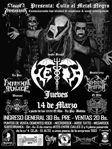 Após o último evento da primeira parte – que acontecerá no dia 10/março em Huanuni-Oruro – o grupo viaja para La Paz, onde estarão ao lado de Infernal Malice, Serpeinte Profana, Balberith e 1979 no “Culto Al Metal Negro”, que ocorre na quinta-feira (14/março). Para mais informações clique aqui.