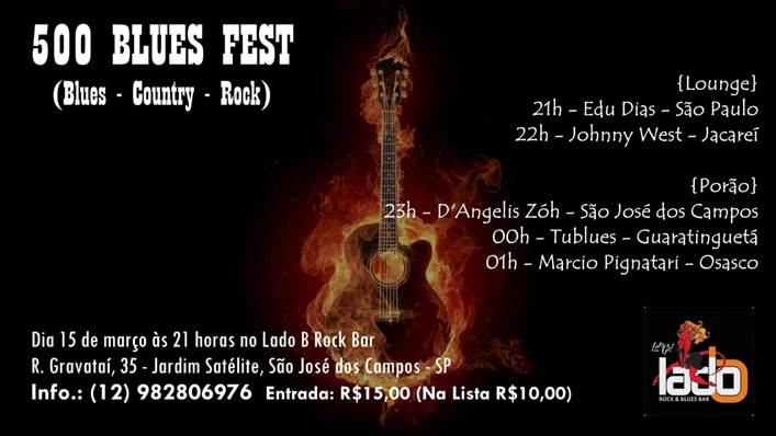 A convite de Johnny West (Jacareí) o cantor e músico Gerson D’Angelis Zóh, junto com sua banda, participa como anfitrião em sua cidade São José dos Campos/SP do “500 Blues Fest”, em comemoração de 500 shows realizados por Johnny West, o Fenômeno do Blues.