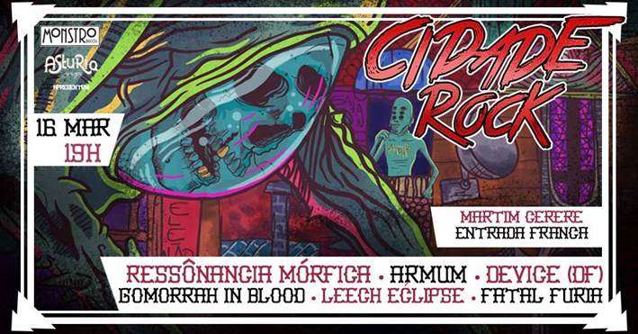 A segunda edição do “Cidade Rock 2019” aposta em uma noite com sons mais pesado e agressivos e grandes nomes do Thrash, Death Metal e do Grindcore. Na etapa do dia 16 de março, as atrações serão as bandas Ressonância Mórfica, Armum, Gomorrah in Blood, Leech Eclipse e Fatal Fúria e, ainda, a brasiliense Device. Os shows começam às 19h00, no Martim Cererê, e a entrada é franca.