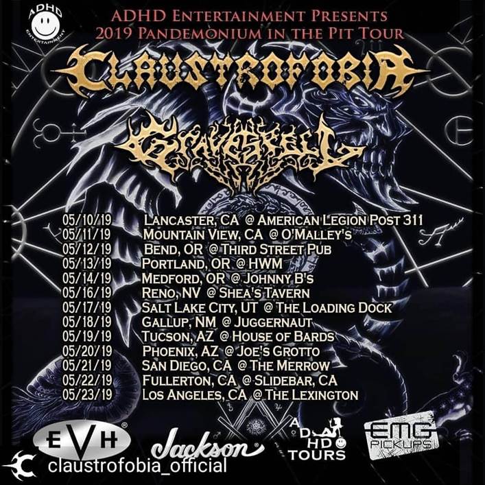 A tour, intitulada de “Pandemoniun In The Pit”, terá início hoje, dia 10 de maio de 2019, e contará com 13 datas, sendo o último dia 23 de maio, ou seja, o Claustrofobia em um prazo de 14 dias estará em 13 cidades diferentes levando todo seu peso e qualidade para os headbangers americanos.