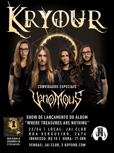 O quarteto paulistano Kryour fará o show de lançamento do álbum de estreia, “Where Treasures Are Nothing”, no dia 22 de junho de 2019, a partir das 17h30, no Jai Club, em São Paulo (SP). O evento ainda contará com a presença do Venomous, que recentemente lançou o single “Black Embrace”.