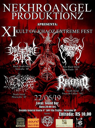 E no dia 22/06/2019 a banda fará parte do “XI Kult ov Khaoz Extreme Fest”, em Sorocaba/SP, ao lado das bandas Reversed, Shadows Hell e Inhumane Rites, no Sound Bar, localizado na Av. Gen. Osório, 509, com início marcado para as 20h00. Confira mais detalhes sobre o “XI Kult ov Khaoz Extreme Fest” clicando aqui.