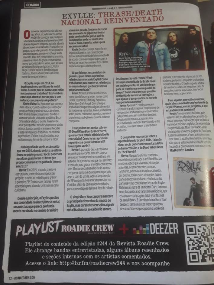 O Thrash/Death Metal dos curitibanos do Exylle é destaque na atual edição da revista Roadie Crew #244. Com uma página inteira, a banda concedeu uma entrevista exclusiva e que revela detalhes pertinentes sobre o novo trabalho de estúdio, o qual está muito próximo de seu lançamento.