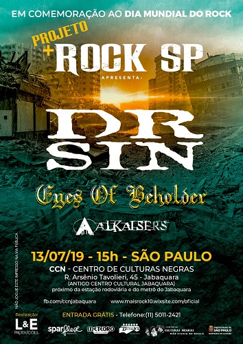 Visando comemorar o dia mundial do Rock em grande estilo, o evento será realizado no CCN - Centro de Culturas Negras, antigo Centro Cultural Jabaquara -, no dia 13/07/2019 e contará com um pesadíssimo ‘cast’, com Dr. Sin, Eyes Of Beholder e Alkaisers, além de Anderson John (apresentador do Programa Pop Stilo) como mestre de cerimônia. Para mais informações clique aqui.