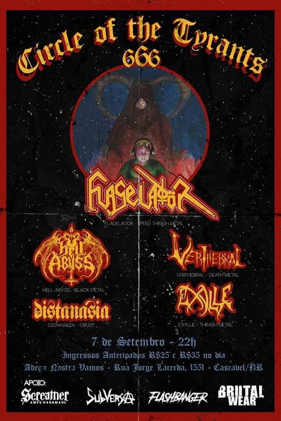 A banda estará no “Circle Of The Tyrants Fest VI”, que acontecerá na Adega Nostra-Vamos e contará com também com Flagelador, Distanasia, Exylle e Hell Abyss. O cartaz pode ser visualizado acima. Para mais informações clique aqui. Ingressos online podem ser adquiridos aqui.