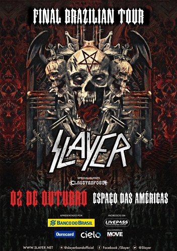O Slayer acaba de publicar em sua página oficial no Facebook a arte de seu show em São Paulo, que irá ocorrer dia 02 de outubro de 2019, no Espaço das Américas.