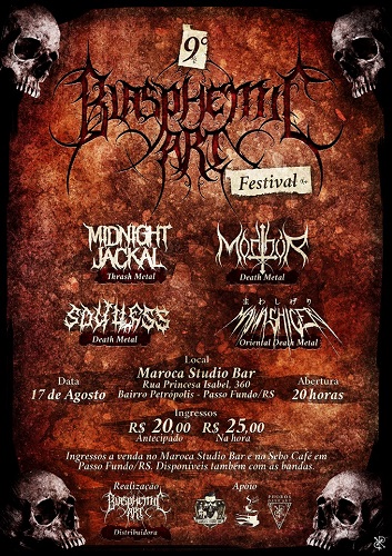 Trata-se da nona edição do “Blasphemic Art Festival”, que acontece no dia 17/08/2019 no Maroca Studio Bar e contará também com as bandas MawashiGeri, Midnight Jackal e Soulless. Para mais informações clique aqui.