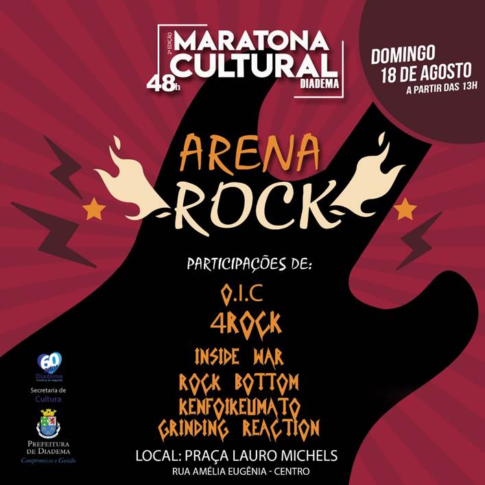 Na cidade de Diadema/SP será realizado o “Maratona Cultural”. O evento será realizado amanhã, dia 18 de agosto de 2019, e irá contar com seis bandas se apresentando gratuitamente.