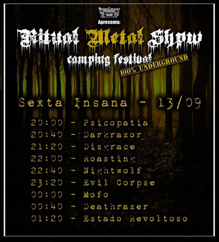 Um festival de dimensões gigantescas está sendo organizado em Valparaíso de Goiás. O “Ritual Metal Show” reunirá mais de 20 bandas em dois dias de shows e três dias de camping, em uma chácara, que terá entre os dias 13 e 14 de setembro de 2019 uma verdadeira odisseia ao Metal nacional.