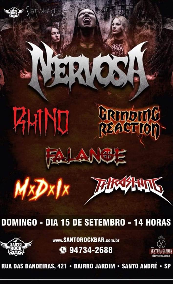 Está chegando a hora! Será no próximo domingo (15/09/2019) a apresentação da banda Nervosa, Grinding Reaction, Rhino, Falange, MDI e Thrashing, na cidade de Santo André/SP.