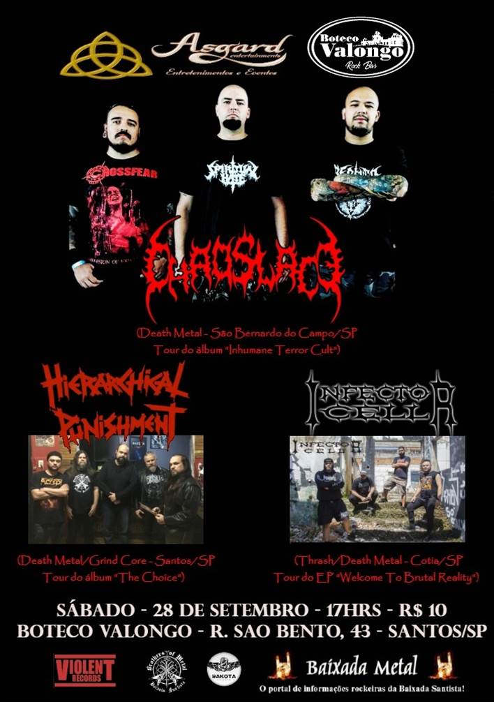 O evento também contará com as bandas Chaoslace e Hierarchical Punishment que levam seus trabalhos ao público que comparecer no Boteco Valongo a partir das 17h00.