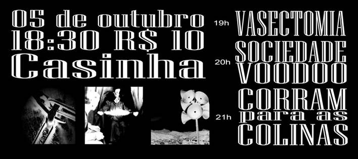 Dia 05 de outubro de 2019 três excelentes bandas se apresentam na “Casinha”, espaço de músico autoral da cidade de Curitiba/PR. O evento intitulado de “Bruxaria na Casinha”, apresenta ao público as bandas Corram Para as Colinas, Vasectomia e Sociedade Voodoo. O evento terá início às 18h00 e os ingressos estão sendo vendidos pelo valor de R$ 10,00.