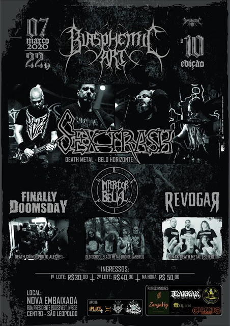 Os cariocas estarão na décima edição do “Blasphemic Art Festival”, que acontecerá em São Leopoldo/RS, no dia 07/03/2020, e contará com outros grandes nomes do cenário nacional, como Finally Doomsday, Revogar e a lendária banda mineira Sex Trash. Para mais informações clique aqui.