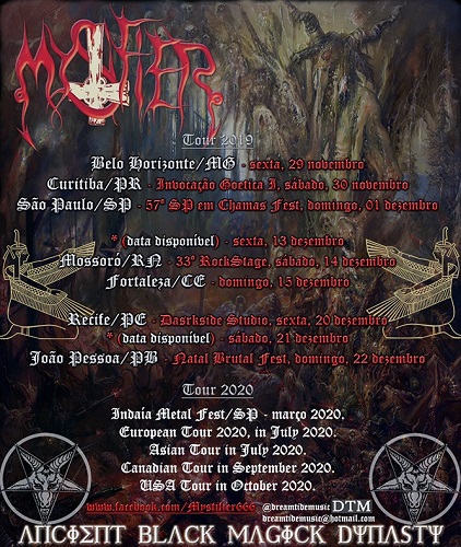 A lendária banda baiana de Black Metal Mystifier, uma das pioneiras do Metal Extremo sul-americano, anuncia novas datas para a divulgação do disco “Protogoni Mavri Magick Dynasteia”, para o final de 2019 e algumas datas para o próximo ano de 2020, além de turnês por todo o Globo Terrestre.