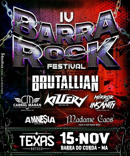 Acaba de ser confirmado o nome das bandas que estarão se apresentando no “IV Barra Rock Festival”, que será realizado dia 15 de novembro de 2019, na cidade de Barra do Corda/MA.
