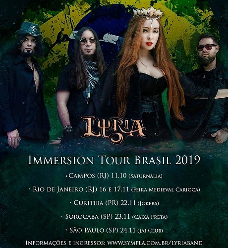 Uma das bandas de maior destaque na cena Metal do país, o Lyria divulgou a agenda de shows até o fim do ano (2019). Com shows no Rio de Janeiro, São Paulo e Paraná, o grupo mostra que a turnê “Immersion” continua a atrair cada vez mais público para as apresentações. A tour passará pelas cidades do Rio de Janeiro (16 e 17/11), de Curitiba (22/11), de Sorocaba (23/11) e de São Paulo (24/11).