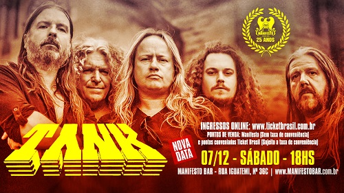 O grupo inglês Tank, que surgiu na fase da New Wave of British Heavy Metal, se apresentará no próximo dia 07 de dezembro de 2019 (sábado) no Manifesto Bar, em São Paulo. “Estamos ansiosos para voltar ao Brasil com esta formação para apresentar um repertório que será matador”, disse o guitarrista Mick Tucker. “O lado bom da mudança de data é que poderemos apresentar para vocês alguma música nova, inédita, que fará parte de nosso novo álbum”, acrescentou.