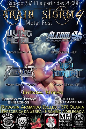Dia 23 de novembro de 2019, em Itapecerica da Serra/SP, será realizado o “Brain Storm 9 – Metal Fest”. Quatro bandas irão se apresenta ao público que comparecer no Rancho do Rock and Roll.