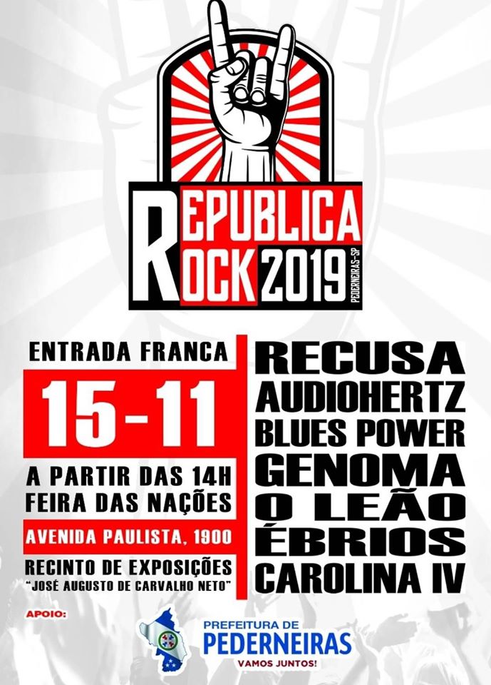 Na sexta-feira a banda participa do Festival República Rock, que será realizado no Recinto de Exposições “José Augusto de Carvalho Neto” (Recinto da Feira das Nações), a partir das 14h00, com apoio da Secretaria Municipal de Cultura e Turismo da Prefeitura de Pederneiras. A Carolina IV tocará ao lado das bandas Recusa, AudioHertz, Blues Power, Genoma, O Leão e Ébrios. “É um evento importante para a valorização dos grupos musicais de nossa cidade. Deixo meu convite aqui para toda a população de Pederneiras e região, para que venham prestigiar as nossas bandas, venham aproveitar o feriado e curtir um bom Rock da nossa cidade”, destaca o prefeito Vicente Minguili. O festival terá entrada gratuita e praça de alimentação revertida para entidades municipais. Mais informações sobre o Festival República Rock aqui.