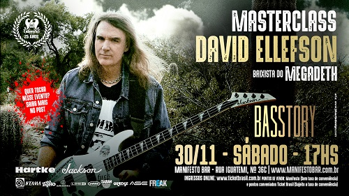 O baixista do Megadeth, que prepara seu décimo sexto álbum, sucessor do premiado “Dystopia” (2016), vencedor do Grammy Awards, na categoria “Melhor Performance de Metal” com a música homônima, o baixista David Ellefson definiu o repertório que será apresentado em sua masterclass “Basstory Tour”, com a qual, desde 2018, tem visitado diversas cidades americanas, além de países como República Tcheca, Dinamarca, Itália, Turquia, Alemanha, Holanda, Polônia, Austrália, México e Chile. Ellefson desembarca no Brasil no dia 30 de novembro (sábado), para show único, em São Paulo, no tradicional Manifesto Bar, que em 2019 está celebrando 25 anos de atividades. Os ingressos online estão à venda através da Ticket Brasil.